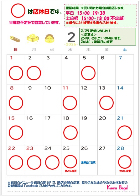 ※2/25更新しました! 3月の営業カレンダーは調整中の為、確定次第お知らせします。
